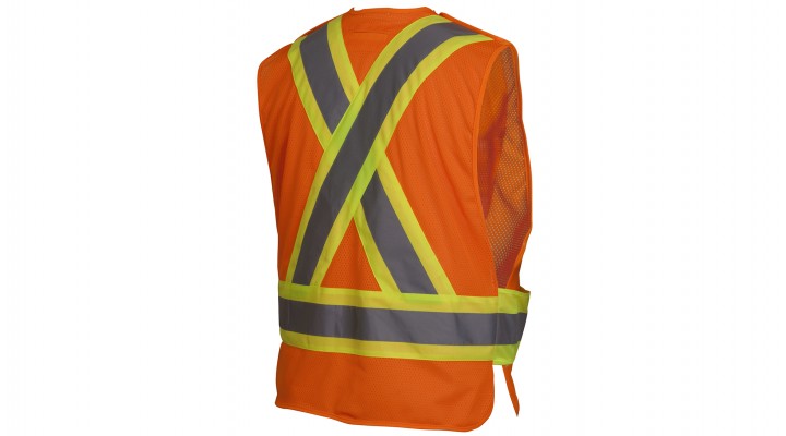 Hi-Vis lightweight polyester mesh material. 2” silver reflective material with 4” contrasting color trim. Adjustable waist band. Breakaway hook and loop shoulders, sides and front closure. 3 pockets: 1 outside, 2 inside. Outside chest pocket with hook and loop closure. Deep and wide inside pockets. Reinforced D-ring slot.